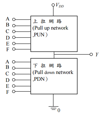 【已刪除】五、如圖為一 6 個輸入端的 CMOS 邏輯閘(logic gate)電路方塊圖,請利用 CMOS 電 路畫出