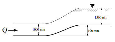 【已刪除】四、穩定水流(steady water flow)流經寬度 2.0 m 的矩形渠道,其示意圖如下。若上游 水深度 1000 mm,而水流過渠道底部隆起 100 mm 處,水面上升 600 mm。今不考 慮黏性效應,請計算該矩形渠道水流量 Q 為若干?(20 分)