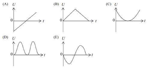 5. 有一質量可忽略的理想彈簧一端固定,另一端繫有一質點,在光滑水平面上作一維簡諧運動, 則在一個週期內,彈性位能 U 隨時間 t 的變化圖最可能為下列何者?