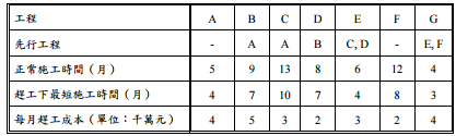 【已刪除】三、綠光太陽能電力建廠計畫包含七大工程(Activities A, B, . . . , G),其工程先行順序、 施工時間、每月趕工成本預估值如下表: