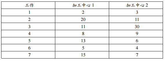 【已刪除】二、有七項工作,均須依序流經兩個加工中心,工時(以小時計)如下表。請為七項工作 排序,繪製甘特圖,並計算最短總完工時間,證明所提出的排序為最佳解。(25 分)