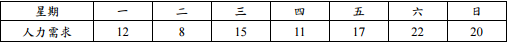 【已刪除】一、全年無休營業之某公司,人員上班採用連續工作五天接著連續休假兩天之方式,依 據經驗每週之人力需求如下所示: