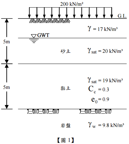 【已刪除】二、如【圖 1】所示,某正常壓密之黏土層厚度 5 m,上覆 5 m厚之砂土層,地表有 200 kN/m