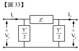 33.【圖 33】為長程輸電線之等效電路,其中 V1 與 I1 分別為送電端的電壓與電流,V2與 I2 分別為受電端的電壓與電流,若輸電線之長度為 、特性阻抗(characteristic impedance)為 、傳播常數(propagation constant)為 γ ,則 Z' 為多少?
