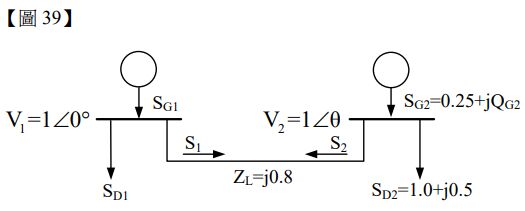 29.在【圖 29】中,匯流排 1 之電壓為 V1=1∠90°、匯流排 2 之電壓為 V2=1∠0°,若兩個匯流排間的輸 電線阻抗,則由匯流排 1 送出的複數功率 S1 為多少?