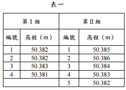 【已刪除】一、今有兩組工作人員,對A、B兩點實施高程差測量,分別為四次與五次測回(施測 結果如表一所示)。請問各組分別計算之算數平均值及觀測誤差為何?全體考量之 最或是值為何?(15 分)