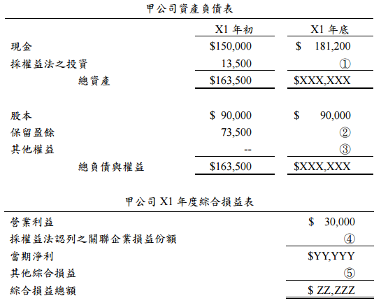 (三)假設乙公司資產及負債之帳面金額與其公允價值沒有任何差異,且並無任何 未認列之可辨認資產及負債。若甲公司將該權益投資分類為「採權益法之投 資」,關於此權益投資,甲公司 X1 年底資產負債表與 X1 年度綜合損益表 中①至⑤相關項目之金額為何?(5 分)