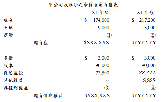 (六)承(三) 題,假設甲公司須就此權益投資編製合併財務報表,且選擇就移轉對價 公允價值衡量非控制權益,若商譽於 X1 年並無減損,則 X1 年初與 X1 年 底合併資產負債表①至④相關項目之金額為何?(4 分)