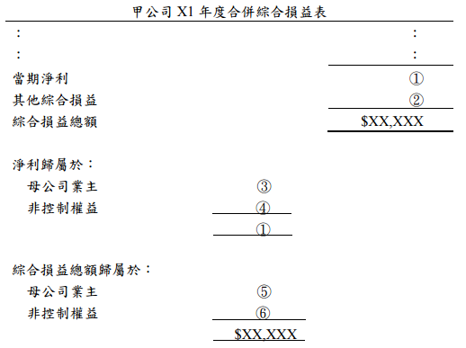 (四)承(三) 題,假設甲公司須就此權益投資編製合併財務報表,則 X1 年度合併綜 合損益表中①至⑥相關項目之金額為何?(6 分)