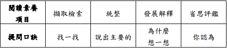 請參考閱讀素養與提問口訣,設計4-6題可用於課堂的提問。請注意, 這些提問的存在是為了協助學生閱讀與思考。