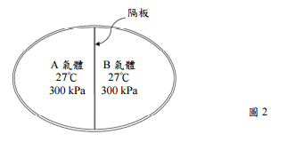 【已刪除】五、ADF 研究單位為證明將混合氣體進行分離的困難程度,遂設計以下實驗。將 4 kmol 的 A 氣體與 6 kmol 的 B 氣體分別注入一個中間以隔板分隔之球狀絕熱容器的兩邊 (圖 2)。實驗開始後,便將中間隔板抽離,讓兩種氣體進行混合。已知 A、B 兩種 氣體特性均與理想氣體相同,氣體常數為 8.314 kJ/kmol·K。請問,當僅考慮能量問 題時,欲反轉此氣體混合過程(使混合氣體回復原分離狀態),需輸入之能量為何? (20 分)