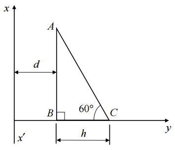 【已刪除】二、如圖所示,試求無窮長導線xx′與直角三角形導線環 ABC 間之互感,其中 AB 平行於 xx′,且距離為 d,BC 的長度為 h。(20 分)