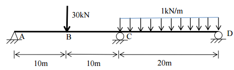 【已刪除】四、如圖所示梁結構 A 為鉸支承,C、D 為滾支承。於 B 點承受 30 kN 集中力並承受支 承 C 到 D 之均佈載重 1 kN/m。求支承 A 之轉角。方法不拘,可利用所附梁變形公式。 (25 分)