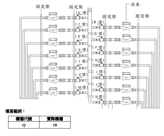 【已刪除】貳、非選擇題一大題(配分 20 分) 題目一: 以下為凱西家頂樓的立式水表圖,他家水表各樓層表位標示牌要重新製作,請問各樓層表位 A、 B、C、D、I、J、K、L、M、N 代號之實際樓層分別為何?【每個答案 2 分】
