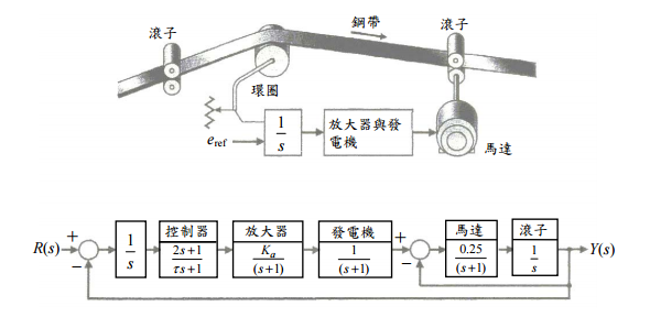 四、圖示為一典型之鋼帶維持等張力系統。環圈(Looper)具有 2 到 3 呎(ft)長之臂, 於端點有一滾子,可被馬達提起並壓於鋼帶上。典型之通過環圈鋼帶速度是 2000 ft/min。一比例於環圈位置之電壓與一參考電壓比較並被積分,其被假設為改 變環圈之位置比例於改變鋼帶之張力。控制器之時間常數 τ,是可忽略相對於系 統之其他時間常數。
