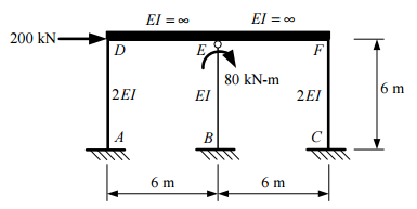 【已刪除】四、如下圖所示之剛架結構,A 點、B 點與 C 點為固定支承(Fixed support),結構中 D 點與 F 點為剛接節點,構件 DEF 為剛性連續梁,亦即 EI = ∞,構件 BE 於 E 端點為 鉸接點,並承載 80 kN-m 彎矩,另有 200 kN 水平力作用於 D 點,構件 AD 與構件 CF 之撓曲剛度為 2EI;構件 BE 之撓曲剛度為 EI,忽略構件軸向變形。試繪製載重下, 剛架之軸力圖、剪力圖與彎矩圖。(25 分)