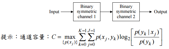 【已刪除】 ⑵下圖所示為一串聯之兩組二元對稱通道,設該兩組二元對稱通道具相同之轉移機 ,試求整體串聯系統之整體通道容量。 10 分)