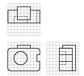 【已刪除】三、許多產品型錄以半斜投影(cabinet projection)來呈現產品立體樣貌,讓產品正面不 變形。下列是一個物體的三視圖,請使用製圖儀器繪製該物體的半斜圖。 (15 分)