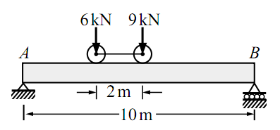 18. 圖(十五)之簡支梁,當移動活載重由左向右通過時,AB 梁之絕對最大彎矩發生於當9 kN 載重與右端 B 的距離為多少時?