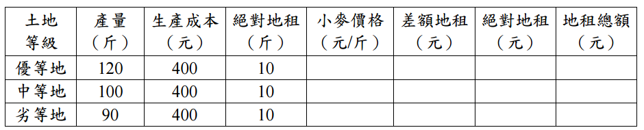 【已刪除】四、李嘉圖(David Ricardo)的差額地租(Differential Rent)理念,以及馬克思(Karl Marx)使用各級土地皆須納等額絕對地租(Absolute Rent)概念,有何不同?今設 有面積相同但肥沃度不等的三塊土地,其投入的生產費相同且已含正常利潤,請援 引兩人地租理論,並按下表所示單位、數值分別計算、填空說明之。(25 分) 注意:請於試卷上繪表依題意答題。
