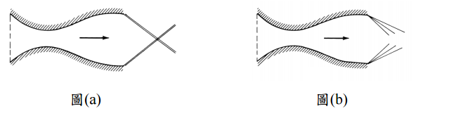 【已刪除】五、高速噴嘴(nozzle)分別在何種情況下會出現如圖(a)之斜震波(Oblique shock), 或如圖(b)之擴張波(expansion wave)?(20 分)
