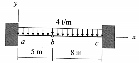 【已刪除】2.有一靜不定樑,如下圖所示,其中b點為鉸鍊,已知b點的剪力為+8.17 t,請使用函數法 晝出其剪力和彎矩圖。(20%)