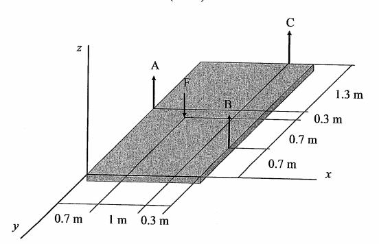 【已刪除】1.有一平板質量102 kg,如下圖所示,被三根繩子(A、B、C)懸吊著,且該平板又承受一個 2kN的重物(F),請求出每根繩子的拉力。(20%)