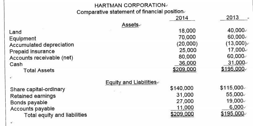 Additional information: 1. Net loss for 2014 is $15,000. 2. Cash dividends of $9,000 were declared and paid in 2014. 3. Land was sold for cash at a loss of $7,000. This was the only land transaction during the year. 4. Equipment with a cost of $15,000 and accumulated depreciation of $10,000 was sold for $5,000 cash. 5. $12,000 of bonds were retired during the year at carrying (book) valu(E) 6. Equipment was acquired for ordinary shares. The fair value of the shares at the time of the exchange was $25,000. Instructions Prepare a statement of cash flows for the year ended 2014, using the indirect metho(D)