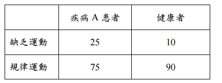 【已刪除】三、假設某一個疾病 A 可能跟缺乏運動有關,你收集了 100 個病人與 100 個健康者的運 動習慣資料如下表,請問這樣的研究方法屬於流行病學中的那種研究法?請你依照 下表資料計算疾病 A 與缺乏運動的相關性(即計算 odds ratio)並加以解釋。(35 分