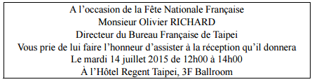 【已刪除】二、Lettre à rédiger:(30 分) Vous venez de recevoir l’invitation ci-dessous. Vous vous excusez de ne pas pouvoir y aller en rédigeant une lettre.