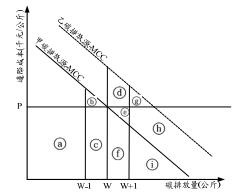分別表示圖中封閉區域 a 面積。試以污染控制經濟理論,依該圖示並嘗試以碳排放量 W(公斤)為基準, 論述對甲、乙兩碳排放源可接受(或可行)之單位碳交易價格,應分別為何?(10 分)
