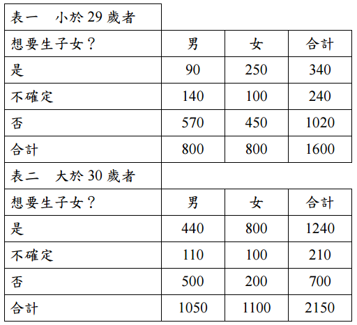 【已刪除】四、政府為了瞭解國人對生育子女的態度,進行了一項隨機抽樣調查,總計調查 3,750 位 20-39 歲男女樣本。下列三維表列出其中一項虛擬的調查數據,為受訪者在未來五年 內是否想生子女的人數分配。請就下表資料內容進行適當的統計分析,並詮釋其結果。(25 分)