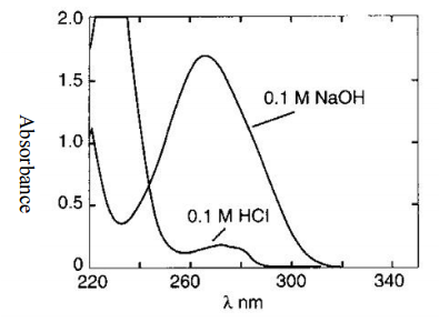 量測,其固定濃度藥液在酸鹼中之量測結果如附圖。另以 其溶於 pH 2.6 緩衝液之相同濃度藥液進行量測,在 280nm 處測得吸光度 0.84,請 計算此藥物之 pK