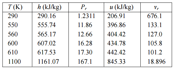 【已刪除】四、有一簡單理想布雷登循環燃氣渦輪機動力廠,其壓力比(pressure ratio)為 10,此 循環的最低溫度及最高溫度分別為 290 K 和 1100 K。若工作流體為空氣,請使用 附表中的數據,於計算前先寫出您的假設,試求⑴壓縮機出口溫度;⑵回功比 (back work ratio);及其⑶熱效率。(25 分) 其中,空氣的理想氣體性質如下(T 為溫度,h 為焓,P