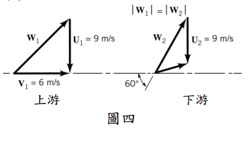 【已刪除】五、一部軸流式輪機機械,其轉子的上游與下游之速度三角形,如圖四所示。請問此部 輪機機械為輪機或風扇?(5 分)試描繪一個適當的葉片截面,並計算每單位質量 流體之功率為何?(15 分)