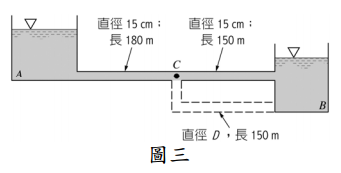 【已刪除】四、如圖三所示,貯槽 A 到貯槽 B 的體積流率,希望藉由節點 C 到貯槽 B 之間另增加 第二條圓管,使其體積流率增加 30%(即流率由 Q 變成 1.30 Q)。倘若 A、B 兩貯 槽自由面高度差 8 m,而且管路的次要損失可忽略不計,則在假設所有管子的摩擦 因子均為 0.02 的情況下,新增圓管的直徑 D 為何?(20 分)