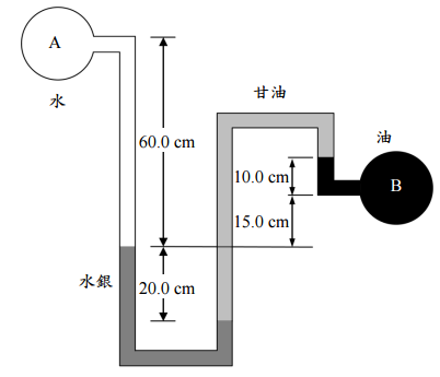 【已刪除】一、水管 A 管與油管 B 管之壓差,係以管壓計量測,如圖所示。已知 A 管之壓應力為 800 Pa,水銀比重為 13.6,甘油密度為 1260 kg/m