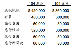 【已刪除】2. A公司104年銷貨收入$2,000,000 -銷貨成本$1,200,000,營業費用$420,000(内含折舊費用 $120,000),營業外支出(利息費用)$60,000,所得稅率25%,與營業活動有關之流動性項目餘額如下: (8分)