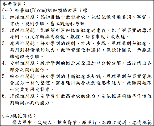 【已刪除】五、教學設計:每則 5 分,共 20 分 布魯姆(Bloom)等將認知領域教學目標分為六大層次,由下而上為 知識、理解、應用、分析、綜合、評鑑等六個層次。請以〈桃花源記〉 為材料,從「理解、應用、分析、綜合、評鑑」當中選擇四個層次, 各設計一個可用於教學的問題,並簡述設計動機。答題範例如下,不 合範例者不予計分。