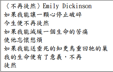【已刪除】二、請以 Emily Dickinson〈不再徒然〉一詩之觀點,以高中生能理 解的生活經驗和生命意境,來為學生詮釋〈醉翁亭記〉、〈岳陽樓記〉、 〈赤壁賦〉、〈黃州快哉亭記〉四篇「生命情懷」之異同。(共 20 分)