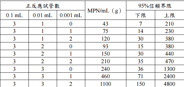 經培養後其正反應試管數為 3, 3, 2 則樣品中每毫升之 MPN , , 為多少?是否超過衛生福利部制定之「一般食品衛生標準」?(30 分) MPN 表