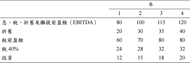 【已刪除】三、下表為 L 公司未來利潤與新廠房及營運資金投資的預測(百萬元)。