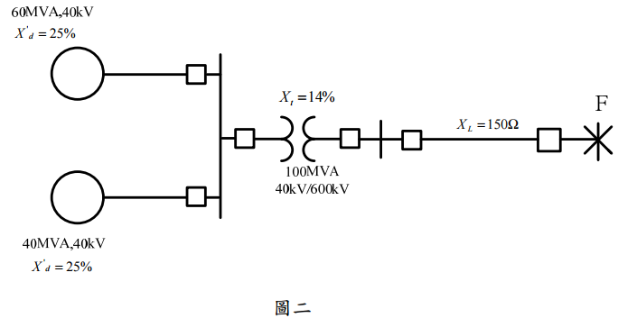 【已刪除】四、如圖二所示之三相電力系統起初無負載,發電機均運轉在額定電壓,且電動勢均同 相位,發電機、變壓器及線路之阻抗如圖所示,所有電阻均忽略。若三相平衡短路 發生在受電端,求短路電流及短路容量(MVA)。(30 分)