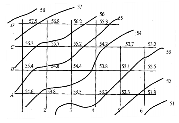 【已刪除】五、土木工程建設可利用地形圖上的等高線配合方格網法估算大區域的土方,並將地面 整平。如圖所示,依據等高線內插估算各格點高程註記於格點右上方。若計算出整 平的高程為 54.4 m,格網邊長 15 m,請依據格點高程和整平的高程計算總挖方量以 及總填方量。(20 分)