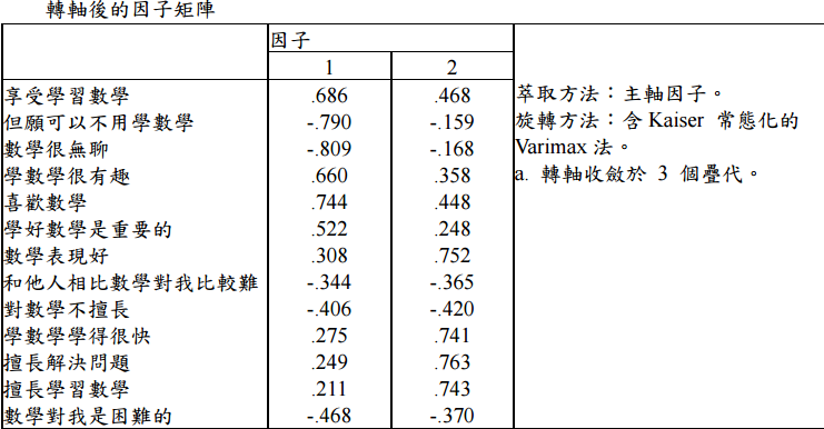 【已刪除】四、研究者根據理論寫出數個問卷題項,為了檢驗其潛在結構,研究者將所有題項進行 因素分析,下面是因素分析結果的部分報表,請根據報表回答問題。試問這些題目 適合進行因素分析嗎?請說明理由。計算解釋總變異量表中① ②的數據,並解釋其 意義。請計算「享受學習數學」以及「但願可以不用學數學」這兩個題項的共同性 (communality)。本分析萃取方法為「主軸因子」(Principal Axis Factoring),其與「主 成分」分析法有何不同?所使用的轉軸方法有何特性?請為因子 1 和 2 命名,並說 明命名的理由。(25 分)