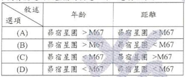 7.圖三、圖四是昴宿星團與M67兩個星團的星色-星等圖(等同於HR圖)。主序星A0之(B-V)=0, (B-V)數值越大,顏色越偏紅。 下列有關這兩個星團的敘述,哪一選項正確? 敘述 選項 年齡 距離