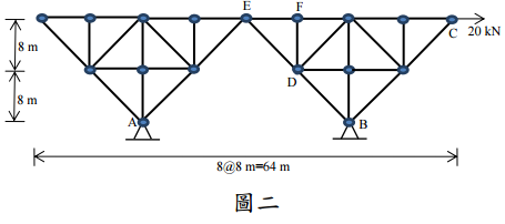 【已刪除】二、如圖二所示桁架結構在 C 點施加一水平力 20 kN。A、B 為鉸支承,整體結構可視為 二子桁架在 E 點鉸接。請分析各反力與桿件 DE、EF 之內力為何?(25 分)