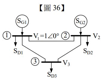 36.某電力系統如【圖 36】所示,在電力潮流分析時,匯流排 2 待求的未知量為:(A)實功率與虛功率 (B)實功率與電壓大小(C)電壓大小與電壓相角 (D)虛功率與電壓相角