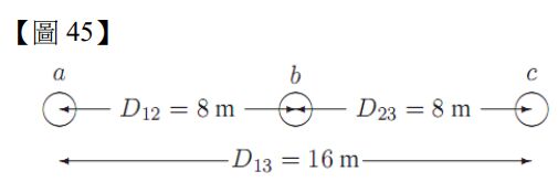 45.一條三相完全換位輸電線每相由一條導線組成,採水平方式架設,導線間距為 8 m,如【圖 45】所示。 每一導線的幾何平均半徑為 2 cm。請問此輸電線每相每公里的電感值為何? (A) 4 mH/km (B) 2 mH/km (C) 1 mH/km (D) 0.5 mH/km