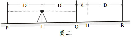 【已刪除】四、如圖二所示,先將水準儀整置水平於 I 處,對 P 和 Q 兩處水準尺讀數分別為 1.218 公 尺和 0.927 公尺;之後再將同一台水準儀整置水平於 II 處,對 P 和 Q 兩處水準尺讀數 分別為 1.492 公尺和 1.195 公尺,另又對 R 點水準尺讀數為 1.056 公尺。若僅考慮視 準軸誤差,且水平距 D = 25 公尺,d = 5 公尺,試計算 P、Q 兩點高程差,以及該水準 儀的視準軸誤差,此項誤差請以角度量且以秒為單位來表示,並須註明俯角或仰角。 又在水準儀整置水平於 II 處時,若要校正此項誤差,應調整水準儀十字絲,使十字絲 的橫絲對準於 P 處水準尺讀數何處?另外,若已知 P 點的高程為 10.000 公尺,試求 R 點的高程。 (25 分)
